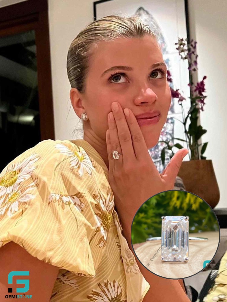 The Sofia Richie Ring is a classic solitaire featuring a large Emerald Cut Diamond, estimated to be between 4 to 6 carats, set on a thin platinum or white gold band. It’s believed to be custom designed, possibly by a private jeweler or a luxury name like Lorraine Schwartz, who has worked with many A-list celebrities.